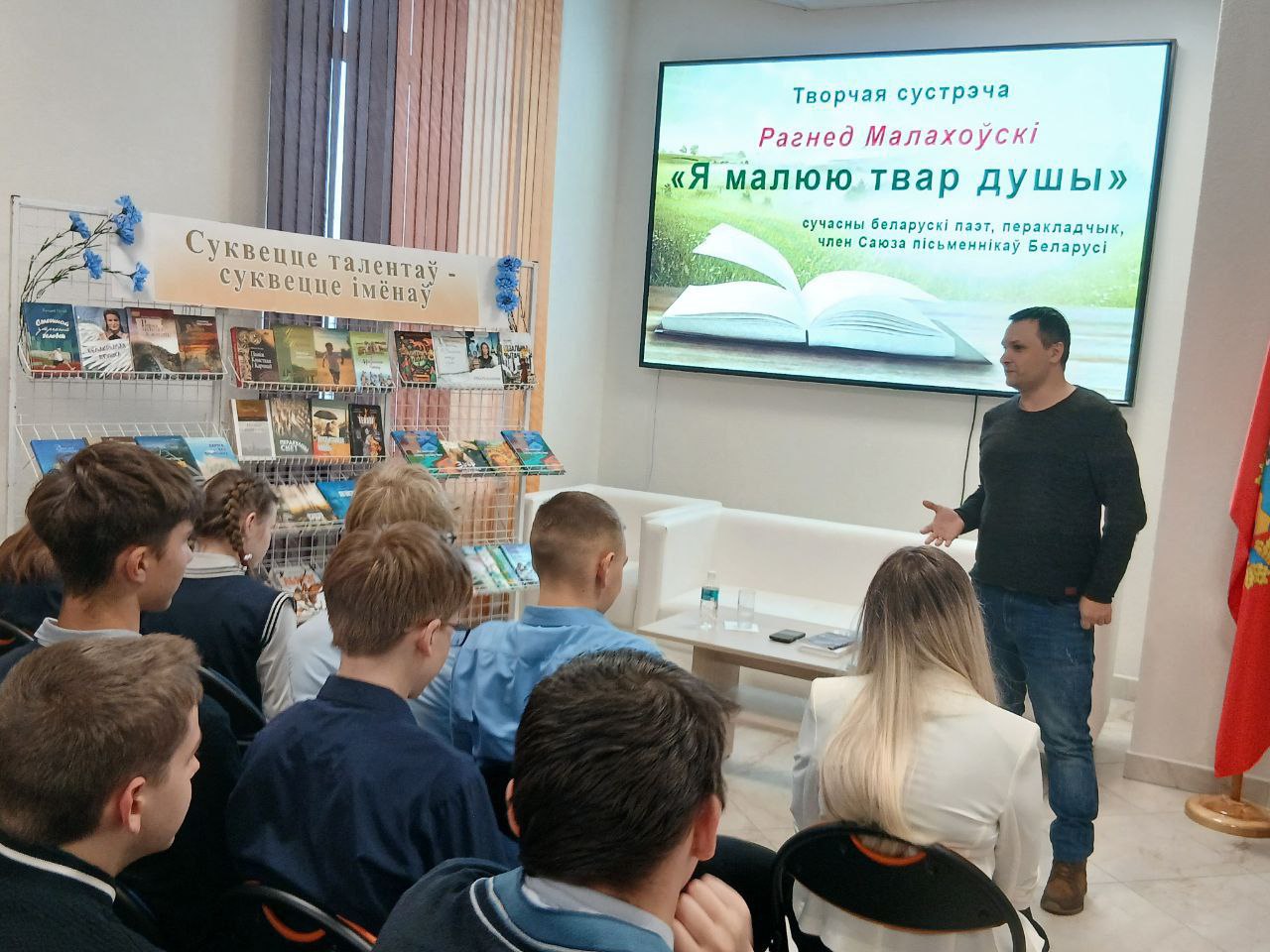 26 лістапада на Бярэзіншчыне адбыўся традыцыйны фестываль беларускай кнігі “Кніжныя гарызонты”. У Бярэзінскай цэнтральнай раённай бібліятэцы адбыліся сустрэчы беларускіх пісьменнікаў з бярэзінскімі кнігалюбамі- прыхільнікамі прыгожага пісьменства. Старшакласнікам была адрасавана творчая сустрэча з паэтам, намеснікам старшыні Мінскага абласнога аддзялення Саюза пісьменнікаў Беларусі, рэдактарам аддзела паэзіі штотыднёвіка “Літаратура і мастацтва” Рагнедам Малахоўскім “Я малюю фарбамі душы”. Рагнед Юр’евіч шчыра падзяліўся з маладымі сучаснікамі сваімі творчымі набыткамі і поглядамі на ролю сучаснай літаратуры ў грамадстве. Жадаючыя маглі набыць паэтычныя зборнікі аўтара з аўтографамі.