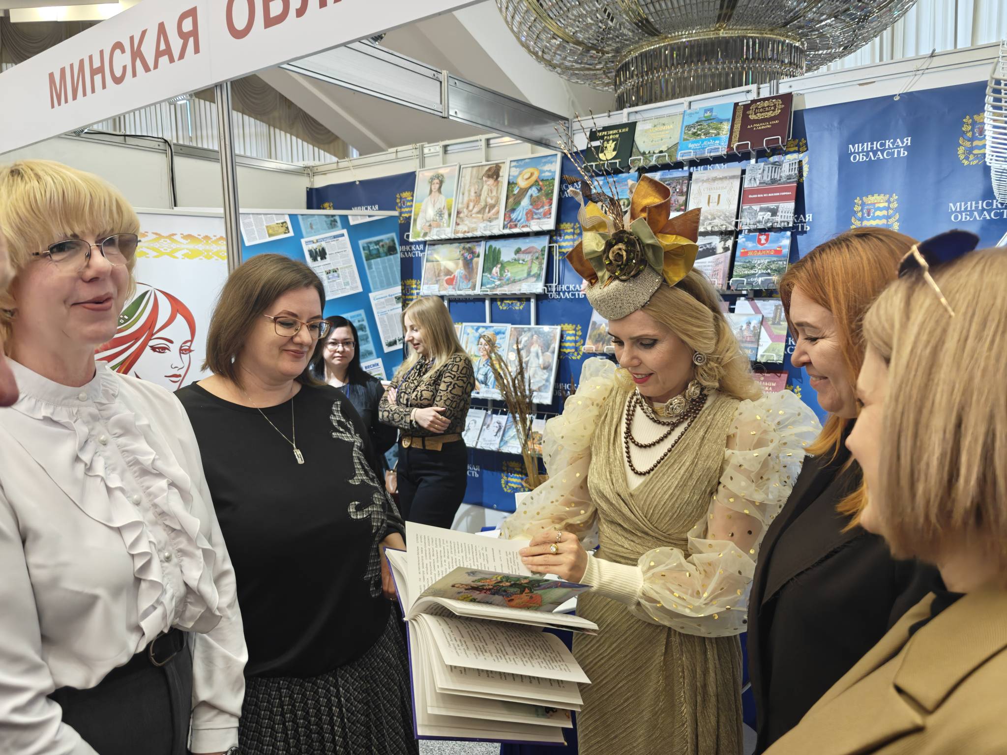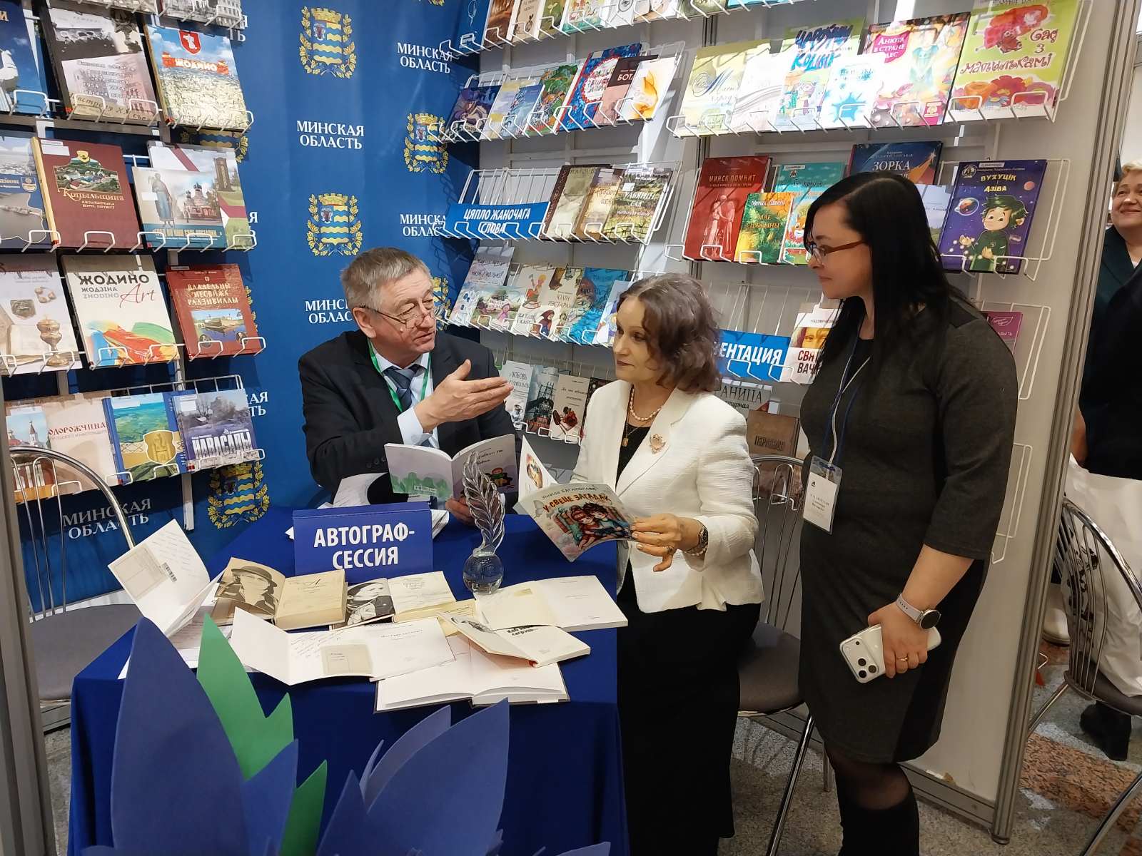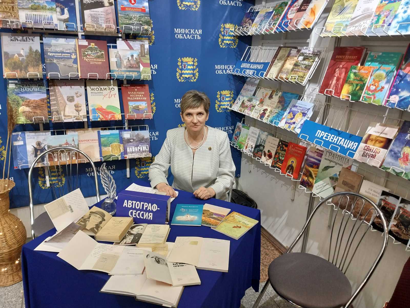 На працягу дня кнігамі літаратараў актыўна цікавіліся шматлікія наведвальнікі пляцоўкі. Ганаровымі гасцямі сталі члены дэлегацыі бібліятэкараў з Гродненскай вобласці, якіх ветліва сустракала дзіцячая пісьменніца Кацярына Хадасевіч-Лісавая.